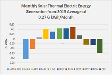 In 2015, utility scale solar[59] contributed 26.47 G kWh (billion kWh) to the grid with 23.233 G kWh from photovoltaics and 3.24 G kWh from thermal systems. In 2014 and 2015, EIA estimated that distributed solar>[60] generated 9.536 G kWh and 12.141 G kWh respectively.