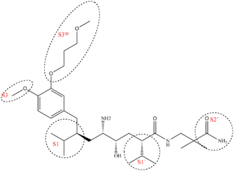 Example of binding to the renin inhibitor: Aliskiren is a peptide-like renin inhibitor and, unlike most, it is rather hydrophilic. It blocks the catalytic function of the enzyme by occupying the S3 to S2′ pockets, except the S2 pocket. Aliskiren also binds to the S3sp subpocket and because that pocket is distinct for renin, aliskiren does not inhibit other aspartic proteases, such as cathepsin D and pepsin.[40] The side chain of aliskiren binds the S3sp subpocket ideally, and leads to its quality as an inhibitor of human renin.[6] The hydroxyl group in aliskiren forms a hydrogen bond with both oxygen atoms of the Asp32. The amine group forms a hydrogen bond with the carboxylic acid group of Gly217 and the oxygen atom of the Asp32. The methoxy group on the aromatic ring fills the S3 pocket and may possibly form a hydrogen bond with a secondary amine group of Tyr14. The amide group forms a hydrogen bond with a secondary amine group of Ser76.[41] The S1 and S1′ pockets are occupied by the two propyl groups in positions P1 and P1′.[39] The terminal amide in position P2′ anchors the amide tail in the active site by forming a hydrogen bond with Arg74 in the S2′ pocket.[43]
