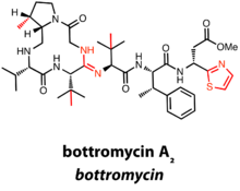 . PMID 11805306. - 1 2 Shimamura H, Gouda H, Nagai K, et al. (2009). "Structure determination and total synthesis of bottromycin A2: a potent antibiotic against MRSA and VRE". Angew. Chem. Int. Ed. Engl. 48 (5): 914–7. doi:10.1002/anie.200804138. PMID 19115340.