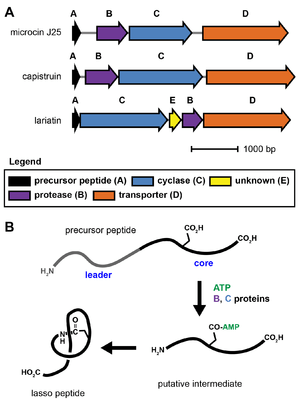 Some lasso peptide biosynthetic gene clusters also require an additional protein of unknown function for biosynthesis. Additionally, lasso peptide gene clusters usually include an ABC transporter (D protein) or an isopeptidase, although these are not strictly required for lasso peptide biosynthesis and are sometimes absent.[15] No X-ray crystal structure is yet known for any lasso peptide biosynthetic protein.