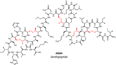 . PMID 19047393. - ↑ Lubelski J, Rink R, Khusainov R, Moll GN, Kuipers OP (2008). "Biosynthesis, immunity, regulation, mode of action and engineering of the model lantibiotic nisin". Cellular and Molecular Life Sciences : CMLS. 65 (3): 455–76. doi:10.1007/s00018-007-7171-2. PMID 17965835.