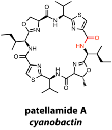 . PMID 22522320. - ↑ Donia MS, Schmidt EW (2011). "Linking chemistry and genetics in the growing cyanobactin natural products family". Chemistry & Biology. 18 (4): 508–19. doi:10.1016/j.chembiol.2011.01.019. PMC 3119926