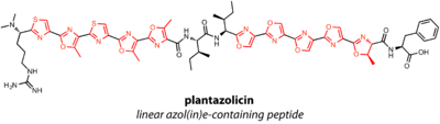 - ↑ Molohon KJ, Melby JO, Lee J, Evans BS, Dunbar KL, Bumpus SB, Kelleher NL, Mitchell DA (2011). "Structure determination and interception of biosynthetic intermediates for the plantazolicin class of highly discriminating antibiotics". ACS Chemical Biology. 6 (12): 1307–13. doi:10.1021/cb200339d. PMC 3241860