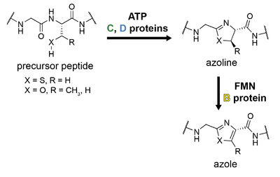 The hallmark of linear azol(in)e-containing peptide (LAP) biosynthesis is the formation of azol(in)e heterocycles from the nucleophilic amino acids serine, threonine, or cysteine.[1][41] This is accomplished by three enzymes referred to as the B, C, and D proteins; the precursor peptide is referred to as the A protein, as in other classes.[1]