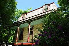 Siding on the structure is made of horizontal wood boards and is painted yellow with burgundy and Aquamarine accents.[5] Other exterior accents include bracketed posts and wood dentils.[4] There are three porches on the outside as well, each topped with a matching mansard roof on a smaller scale than the main roof.[4] One of these porches is a sun porch enclosed with glass, while the other two have arcaded bases supporting the roof.[4] The posts are decorated with detailed scroll work at the top.[4] Parts of the home have sets of paired windows, and the main entrance has an arched transom light to go with the pediment above the window.[4]