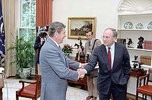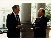 Cheney was Assistant to the President and White House Deputy Chief of Staff under Gerald Ford.[27] When Rumsfeld was named Secretary of Defense, Cheney became White House Chief of Staff, succeeding Rumsfeld.[20] He later was campaign manager for Ford's 1976 presidential campaign.[28]