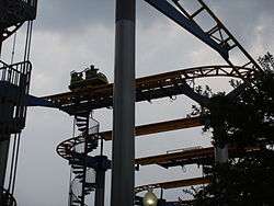 The ride is painted in high-contrast blue and sunglow orange, and the track layout consists of several high hairpin switchbacks followed by a pair of steep drops.
