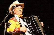 Riders in the Sky appearing at the Ponca Theatre in Ponca City, Oklahoma on September 29, 2007 at a concert commemorating the 100th anniversary of the birth of Gene Autry. From left to right are Joey the Cow Polka King, Woody Paul, Ranger Doug and Too Slim. | |