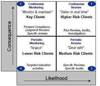 In this example, The ATO links its strategies to the likelihood and/or consequences of entities not complying with a law. The ATO risk matrix to the left shows how the ATO divides its clients into four categories, and allocates appropriate detection strategies to each category.