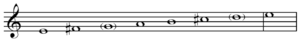 The ritsu and ryo scales are scales in Japanese music, specifically shōmyō. Ryo is only transposable to D and G and ritsu is only transposable to E and B, the mixed scale on A.[4] The essential difference between this scale and the ritsu scale is the placement of the kaku note, which is a half-step lower in the ryo scale.[4] The ritsu scale is the voice of the male phoenix, yang, being, the voice that ascends from above and is inhaled breath, emerging from the ki while the ryo scale is the voice of the female phoenix, yin, nothingness, the voice that ascends from below and is exhaled breath, emerging from the breath; probably indicating that ritsu is vertical and ryo is horizontal.[5]