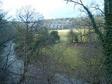 The River Ceiriog (Welsh: Afon Ceiriog) is an 18 miles (29 km) long[1] river in north east Wales. It is a tributary of the River Dee. It rises at an altitude of around 1,800 ft (549 m) on the south east slopes of Moel Fferna in the Berwyn Mountains, and flows through the Ceiriog Valley in Wrexham County Borough. It flows below Chirk Castle and the town of Chirk, where the Chirk Aqueduct carries the Llangollen Canal over the river. The Ceiriog joins the Dee east of the town. In its lower reaches the river forms the border between Wales and Shropshire in England. Home to a Trout fishing club, the river and its valley were described by British Prime Minister David Lloyd George as "a little bit of heaven on earth".[2] As well as being a home to trout the first grayling to be artificially reared in Wales were released into the river in 2009.[3]