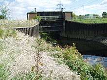 The first regulator to be installed was at Woodhouse Mill.[14] It is a vertical sluice gate, and is situated at the downstream end of the Woodhouse Mill washlands nature reserve. A railway embankment crosses the nature reserve, and flood arches allow the water to flood both sides of the tracks. There are no floodbanks between the river and the reserve, which results in it flooding soon after the gate is closed.[12] The mechanism here was manufactured by Ransomes and Rapier in 1956,[15] and the regulator was commissioned in 1959.[14] The Canklow regulator, situated close to the A630 link road from junction 33 on the M1 motorway, is also a vertical sluice gate, which when closed causes progressive flooding of seven washland areas on both sides of the M1, capable of holding 1,520,500 cubic metres (53,700,000 cu ft) of flood water.[12] It was installed in 1969 as part of a major road-building project, which saw the M1 motorway and the A630 road built across the washlands.[14]