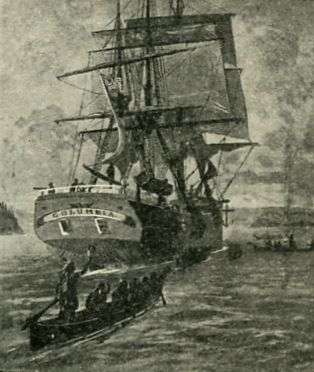 During his first voyage to the northwest coast, Gray was second-in-command of the Columbia Rediviva under Captain John Kendrick, who remained in the Pacific, in command of the Lady Washington. On the journey north along the coast to Nootka Sound, Gray encountered a strong outflow near 46’16”. He spent nine days trying to enter the river without success before abandoning the effort and sailing north for Nootka.[3] Gray rejoined Kendrick for a time after Gray's return to the region.[2] In October the Columbia and crew began building Fort Defiance and a small craft called the Adventure as they prepared to ride out the winter in harbor.[4] After wintering on Vancouver Island, Gray set sail again on April 2, 1792 when he left the American trading post of Clayoquot on Vancouver Island.[2] On this journey aboard the Columbia Rediviva Gray noticed muddy waters flowing from shore and decided to investigate his belief that it might be the "Great River of the West".[1] While waiting for favorable weather, Gray spotted a ship and exchanged greetings with her on April 29. This ship was the HMS Discovery commanded by British naval captain George Vancouver, who doubted that Gray had found a navigable river-mouth.[2]