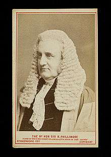 In 1853, he entered the House of Commons as Member of Parliament for Tavistock. A moderate in politics, his energies were devoted to non-party measures, and in 1854 he introduced the bill for allowing viva voce evidence in the ecclesiastical courts. He sat for Tavistock until 1857, when he offered himself as a candidate for Coventry, but was defeated. He was appointed judge of the Cinque Ports in 1855, Queen's Counsel in 1858, and advocate general in admiralty in 1862.[1] In 1867, he was sworn a member of the Privy Council and took his place as a member of the Judicial Committee.[2] As a member of the Judicial Committee, one of his notable decisions was in the Guibord case, concerning church–state relations in Canada. In 1875, in accordance with the Public Worship Regulation Act 1874, he resigned, and was succeeded by Lord Penzance. When the Judicature Act came into force the powers of the admiralty court were transferred to the High Court of Justice, and Sir Robert Phillimore was therefore the last judge of the historic court of the Lord High Admiral of England. He continued to sit as judge for the new admiralty, probate and divorce division until 1883, when he resigned. He wrote Ecclesiastical Law of the Church of England, Commentaries on International Law, and a translation of Lessing's Laokoon.