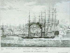 Stopford became Rear-Admiral of the United Kingdom in 1834. His last active post, in his early seventies, was as commander-in-chief of the Mediterranean fleet during the Syrian War against the forces of Mehemet Ali. As Vice Admiral on board HMS Princess Charlotte (100) and subsequently HMS Phoenix, he was in command of the combined British, Turkish, and Austrian fleet during the bombardment of Acre on 3 November 1840. For his services in the Syrian War, Stopford was given the Freedom of the City of the City of London. The ornate silver and oak box is part of the collection of the National Maritime Museum, Greenwich.[7] The following year he became Governor of the Greenwich Hospital at Greenwich,[8] with the rank of Admiral.