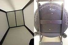 To perform the rod and frame task, an apparatus consisting of a rod in a square frame is used. An example commercial apparatus can be seen in picture 1. When the participant is being tested using the apparatus, their head is fastened firmly in the chin rest to prevent the participant from collecting visual cues from outside of the apparatus. The rod and frame are shown in the center of the far end of the apparatus, which provides a frame of reference to the participant. Both the participant and the experimenter are able to adjust the orientation of the rod, while only the experimenter can adjust the frame orientation by using the appropriate knobs on the apparatus, as seen in picture 2. The experimenter is able to see the exact degree measurement of the rod and frame from vertical, while the participant sees the physical rod and frame inside the apparatus. The methods of constant stimuli, limits, and adjustment can be used to test the participants, but method of limits is most commonly used in research conducted using the rod and frame task.[2] When using the method of limits the experimenter sets the orientation of the rod and frame separately and then the participant is asked to adjust the rod orientation until they perceive it to be vertical. Deviation from true vertical can then be determined. Based on which way the frame is tilted, the rod can be viewed as either being tilted in the same direction as the frame (direct effect), or in the opposite direction of the frame (indirect effect).