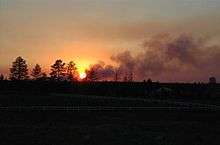 The Rodeo–Chediski Fire was a wildfire that burned in east-central Arizona beginning on June 18, 2002, and was not controlled until July 7.[2] It was the worst forest fire in Arizona's recorded history until June 14, 2011 when the Wallow Fire surpassed Rodeo-Chediski as the largest fire in Arizona history.[3] Several local communities, including Show Low, Pinetop-Lakeside, Heber-Overgaard Claysprings and Pinedale, were threatened and had to be evacuated.