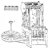 Until the 1740s all spinning was done by hand using a spinning wheel. The state of the art spinning wheel in England was known as the Jersey wheel however an alternative wheel, the Saxony wheel was a double band treadle spinning wheel where the spindle rotated faster than the traveller in a ratio of 8:6, drawing on both was done by the spinners fingers.[1]