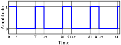 A rectangular pulse wave of duty cycle D, the ratio between the pulse duration () and the period (T); illustrated here with a = 1.