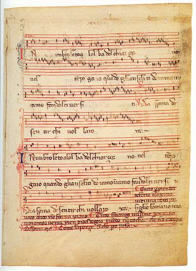 The Rossi Codex is a music manuscript collection of the 14th century. The current manuscript is divided into two sections, one in the Vatican Library and another, smaller section in the Northern Italian town of Ostiglia. The codex contains 37 secular works including madrigals, cacce and, uniquely among trecento sources, monophonic ballatas. The codex is of great interest for trecento musicologists because for many years it was considered the earliest source of fourteenth-century Italian music. Although other pre-1380 sources of secular, polyphonic, Italian music have now been identified, none are nearly so extensive as the Rossi Codex.