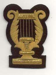 The RA Band lyre, (No. 1 dress version) as worn only by the Royal Artillery's musicians, and on the right forearm (rather than the standard army 'bandsman's lyre' which is worn by all other Army bandsmen and musicians, on the upper arm)