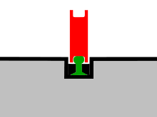 Diagram of the Translohr central guide rail (green) and the vehicle's guide wheels (red), which grasp the rail perpendicular to each other