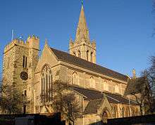 Rugby's main Roman Catholic church is St. Maries on Dunchurch Road. It is one of the town's most well-known landmarks as it is quite dominant on the skyline. Its spire is the tallest in Warwickshire . The church was built in 1872, designed by Pugin in the Early English style.[17]