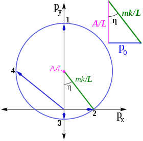 In other words, the momentum vector p is confined to a circle of radius mk/L = L/ℓ centered on (0, A/L). The eccentricity e corresponds to the cosine of the angle η shown in Figure 3.
