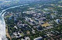 The New Campus is in the Neuenheimer Feld district. It is now the largest part of the university, and the largest campus for natural sciences and life science in Germany.[13] Almost all science faculties and institutes, the medical school, University Hospital Heidelberg, and the science branch of the University Library are situated on the New Campus. Most of the dormitories and the athletic facilities of the university can be found there as well. Several independent research institutes, such as the German Cancer Research Center and two of the Max-Planck-Institutes have settled there. The New Campus is also the seat of several biomedical spin-off companies. The old part of town can be reached by tram and bus in about 10 minutes. The Neuenheimer Feld campus has extensive parking lots for faculty and student vehicles for long term and short term parking, as well as visitors and patients of the various university hospitals. The Faculty of Physics and Astronomy is not located on either campus, but on the Philosophers' Walk, separated from the Old Town by the River Neckar, and some 2 km (1.2 mi) away from the New Campus. It also maintains observatory facilities on the Königstuhl Mountain.[42]