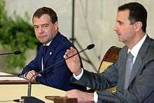 Dmitry Medvedev in a joint press conference with the Syrian President following Russo-Syrian talks in May 2010