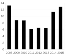 On 16 December 2014, the RTS Index, denominated in U.S. dollars, declined 12%, the most on any given day since the midst of the global financial crisis in November 2008, and the Micex index declined 8.1% at one point before ending the day higher. This increased the decline of RTS Index, up until 16 December, of nearly 30% during the month of December.[55] In response to rising interest rates and bank runs, the interest rate on Russian three-month interbank loans rose to 28.3%, higher than at any point in 2008.[56][57]