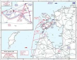 The operation began on the morning of 12 October, when Moltke and the III Squadron ships engaged Russian positions in Tagga Bay while the IV Squadron shelled Russian gun batteries on the Sworbe Peninsula on Saaremaa.[6] Königsberg, still Reuter's flagship, steamed in Tagga Bay, with the commander of the ground troops General Ludwig von Estorff and his staff aboard. Estorff coordinated the operations of the German infantry, who quickly subdued Russian opposition.[7] On 18–19 October, Königsberg and the rest of the II Scouting Group covered minesweepers operating off the island of Dagö, but due to insufficient minesweepers and bad weather, the operation was postponed.[8] On the 19th, Königsberg, her sister ship Nürnberg, and the cruiser Danzig were sent to intercept two Russian torpedo boats reported to be in the area. Reuter could not locate the vessels, and broke off the operation.[9] By 20 October, the islands were under German control and the Russian naval forces had either been destroyed or forced to withdraw. The Admiralstab ordered the naval component to return to the North Sea.[10]