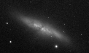 At 19:20 GMT on 21 January 2014, Fossey and his students noticed a bright new star in their images of the galaxy Messier 82, also known as the Cigar Galaxy.[6] After comparing their image to archival ones of the same galaxy, they used observations with a second telescope to eliminate the possibility of an instrumental artefact.[7] Their discovery was reported to the International Astronomical Union's Central Bureau for Astronomical Telegrams, who confirmed that they were the first to spot the supernova and assigned it the name SN 2014J as the tenth supernova discovered in 2014.[6]