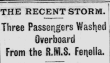 - On Monday 2 January 1899, under the command of Capt. Hill, the Fenella departed Liverpool at 11:30hrs for Douglas during the course of which she encountered severe weather with winds reported to be reaching Hurricane Force 12 resulting in a passage time of 8 hours.[23] At a Dog Show which was taking place at the Palace, Douglas, various rumours began to circulate when the Fenella was known to be overdue and these increased to reports that the Douglas Lifeboat had been dispatched in order to meet the vessel; only for these reports to turn out to be baseless.[23] On reaching Douglas, many passengers recounted their stories of the voyage to local newspapers. Accounts were given of people been thrown from their berths and one lady been thrown across a cabin sustaining cuts to her face.[23] In the Steerage section passengers were reportedly locked in to their accommodation with some sustaining injury as fixtures such as heavy furniture became dislodged.[23]
