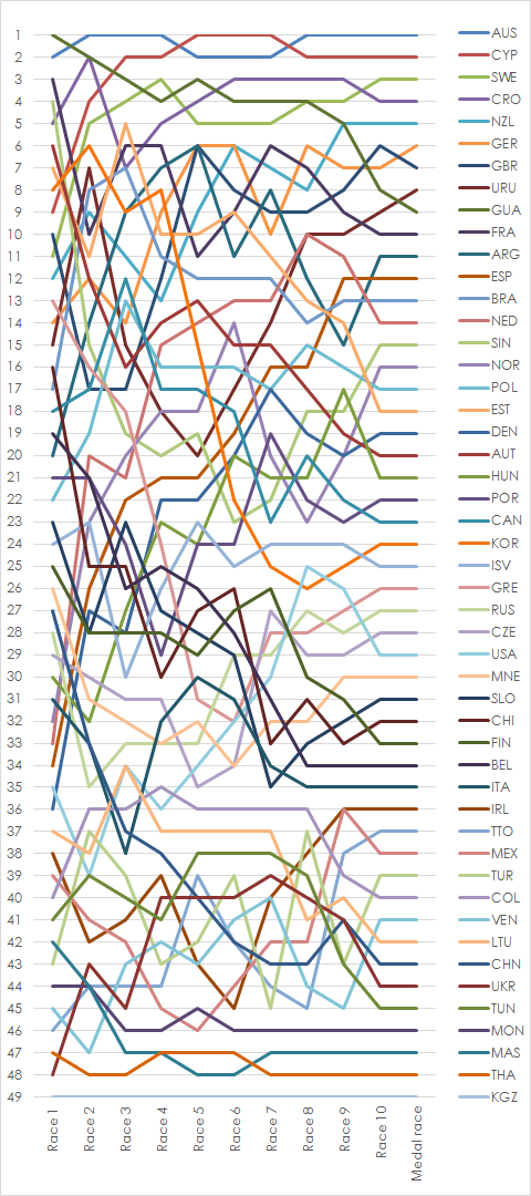 - ↑ For the medal race the top ten boats qualified. Each position scored double points. All medal races were sailed on course area Nothe in front of Weymouth.