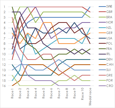 | Rank | Country | Helmsman | Crew | Race 1 | Race 2 | Race 3 | Race 4 | Race 5 | Race 6 | Race 7 | Race 8 | Race 9 | Race 10 | Medalrace | Total | Total – discard | |||||||||||