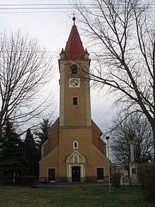 The church was built in the 14th century. It is mentioned in a document at the donation of the village in 1333. It was built in Gothic style. It was vaulted in the 17th century, the roof was also repaired. Only the front side remained in Gothic style. Another reconstruction was done in 1922 along with installing new bells. On November 11, 1922 the reconstructed church was consecrated - since then the winter festival is held. A new organ was installed on December 17, 1925, the tower's roof was covered with sheet metal in 1933. The rectory was built in 1787.