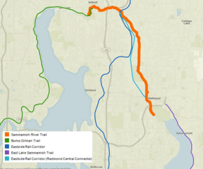 Other trails connecting with the Sammamish River Trail include the Burke-Gilman Trail, Eastside Rail Corridor, East Lake Sammamish Trail, Tolt Pipeline Trail and Puget Power trail.