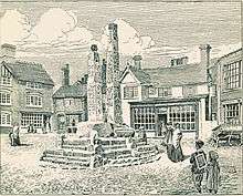 The most recent and authoritative dating places the larger cross from the early part of the 9th century, and the smaller from about the middle of that century.[4] Older theories, now outdated, included the view that they were erected to commemorate the conversion to Christianity of Peada of Mercia about 653.[5][6] Other sources date them to the 9th century.[1][2] The original site of the crosses is unknown and it is believed that they were brought to Sandbach in the Middle Ages.[2] The earliest documentary evidence is by William Smith, the Rouge-Dragon Pursuivant at Arms of Elizabeth I, who was from Nantwich. In 1585 he wrote 'two square crosses of stone, on steps, with certain images and writings thereon graven [standing] hard together.[7][8] Either after the Reformation or during the Civil War they were thrown down[2] and their parts were scattered over a wide area.[5] Larger pieces of the crosses were found as far away as Oulton and Tarporley while smaller pieces were found on various sites in Sandbach. In the early 19th century they were collected together and in 1816 were reassembled and erected under the direction of George Ormerod, the Cheshire historian.[4]