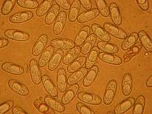 The spores are hyaline (translucent), smooth, and ellipsoid with the ends truncate. They have dimensions of 11.5–20 by 5–9 µm,[9] and usually contain two large oil drops.[28] The paraphyses (sterile, filamentous cells interspersed among the asci, or spore-producing cells) are 5–8 µm wide at the tip, branched, septate (with partitions that divide the cells into compartments), and constricted at the septa.[29] The asci are cylindrical, and measure 300–360 by 10–13 µm; the tips of the asci stain blue with Melzer's reagent. The finely cylindrical paraphyses have slightly swollen tips and are forked at the base.[30]