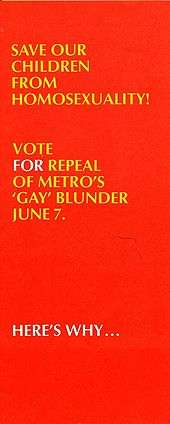 Anita Bryant lent her support to the effort in Wichita, which was led by a minister named Ron Adrian. They used a similar strategy, printing a full-page ad in The Wichita Eagle with newspaper clippings connecting gays to child molestation. They raised approximately $50,000 and used the network of churches, local media, and a highly organized grassroots voter registration and mobilization drive. Campaign literature focused on the aspect gay visibility, and the dangers of gays as role models for children: "There is a real danger that homosexual teachers, social workers or counselors, simply by public acknowledgment of their lifestyles, can encourage sexual deviation in children."[80] In comparison, the very small and closeted gay community raised only $6,000; the National Gay Task Force was so pessimistic they offered no assistance at all. Bryant attended a rally stating the law would give homosexuals "special rights ... and next you will have thieves, prostitutes and people who have relations with St. Bernards asking for the same rights". The Wichita ordinance was defeated by a five to one margin leaving Ron Adrian ecstatic.[81]