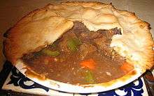 Pot pies with a flaky crust and bottom are also a popular American dish, typically with a filling of meat (particularly beef, chicken, or turkey), gravy, and mixed vegetables (potatoes, carrots, and peas). Frozen pot pies are often sold in individual serving size.