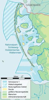 The national park covers an area from the North Sea coast of Schleswig-Holstein by the Danish border in the north to the Elbe estuary in the south. In the northern area (roughly as far as Amrum), the national park boundary extends to the twelve mile territorial limit; to the south it reaches to about the three mile line. On the land side it runs in the sea 150 metres off the coast.[1] Sea dykes and the foreland immediately in front of the dykes are not part of the national park; beaches are thus largely excluded from the protected zone.[2] Also excluded from the national park are the inhabited areas in the sea, including the five German North Frisian Islands and the larger Halligen islands of Langeness, Hooge, Gröde, Oland and Nordstrandischmoor. Part of the park comprises uninhabited islands, islets and Halligen, such as Trischen, Blauort or the North Frisian Barrier Island. Under the classification of the natural regions of Germany the national park area belongs to the "Schleswig-Holstein Wadden Sea, Islands and Halligen" region [3] within the Schleswig-Holstein Marshes, and to the major unit of the German Bight.