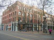 The three Schwabacher brothers' only sister, Barbetta (Babette) Schwabacher (January 3, 1836 – January 7, 1908), married the brothers' business associate Bailey Gatzert in 1861.[1] The couple headed in 1869 for Seattle—then a town of barely 1,000 people—where Gatzert established a branch of Schwabacher Bros. & Company.[8] Gatzert would go on to become Seattle's first (and, as of 2009, only) Jewish mayor.[12] Schwabacher Bros. & Company became Seattle's first wholesaler, with a business opened October 11, 1869.[4] Schwabachers' 1872 Seattle shop at Front Street (now First Avenue South) and Yesler Way was the city's first brick building.[4][13] Under Gatzert's direction, the company also constructed a warehouse,[8] a grist mill,[4] and Schwabacher's Wharf.[8]
