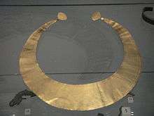 Surviving metalwork includes personal items like the gold lunula or neckplates found at Auchentaggart in Dumfriesshire and Southside, Lanarkshire, which date from about 2000 BCE and are similar to those found in relatively large numbers in Ireland, but also with examples across Great Britain and in Portugal.[38] Jet beaded necklaces strung in a crescent shape have been found at sites including Poltalloch and Melfort in Argyll and Aberlemno in Angus.[39]