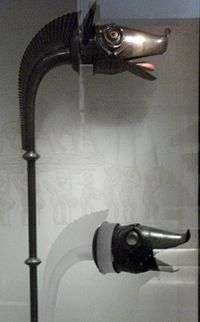 There are surviving ring-headed pins, which were probably made locally and not imported, and appear to be part of a British and Irish type that was not part of the La Tène culture. There are also spiral finger rings, glass beads and long-handled combs, which are found across Britain, but have local characteristics.[49] The bronze Stichill collar is a large engraved necklace, fastened at the back with a pin. The Mortonhall scabbard, probably from the first century CE, is elaborately decorated with trumpet curves and "S"-scrolls. Further north there are finds of massive bronze armlets, often with enamelled decoration, like the ones found at Culbin Sands, Moray.[50] One of the most impressive items from this period is the boars head fragment of the Deskford carnyx, a war-trumpet from Deskford in Banffshire, probably dating from the first century CE. Similar instruments are mentioned in Roman sources and depicted on the Gundestrup Cauldron found in Denmark.[51]