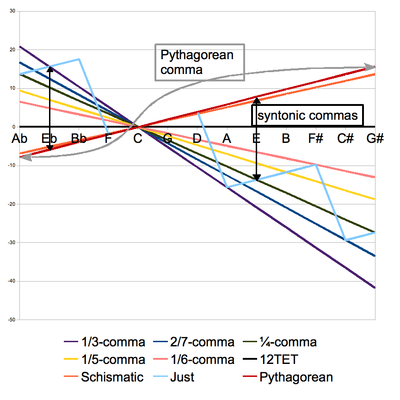 Comparison between tunings: Pythagorean, equal-tempered, 1/4-comma meantone, and others. For each, the common origin is arbitrarily chosen as C. The degrees are arranged in the order or the cycle of fifths; as in each of these tunings except just intonation all fifths are of the same size, the tunings appear as straight lines, the slope indicating the relative tempering with respect to Pythagorean, which has pure fifths (3:2, 702 cents). The Pythagorean A (at the left) is at 792 cents, G (at the right) at 816 cents; the difference is the Pythagorean comma. Equal temperament by definition is such that A and G are at the same level. 1/4 comma meantone produces the "just" major third (5:4, 386 cents, a syntonic comma lower than the Pythagorean one of 408 cents). 1/3 comma meantone produces the "just" minor third (6:5, 316 cents, a syntonic comma higher than the Pythagorean one of 294 cents). In both these meantone temperaments, the enharmony, here the difference between A and G, is much larger than in Pythagorean, and with the flat degree higher than the sharp one.