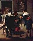 Las Meninas, in which Diego Velázquez depicted himself in a similar pose with brush and palette, is considered an important precedent for the Self-Portrait with Palette. There the painter stands almost in the background of his studio, while his models, the five-year-old Margarita Teresa of Spain and her servants, occupy the foreground. From here Manet appropriated the pose of the painter and his equipment, but as opposed to Velázquez, he makes himself the thematic center of the image. At the same time, however, he is working on a painting, but leaves its subject matter, as well as his surroundings, to the imagination of the viewer. Manet himself between 1865 and 1870 portrayed Velázquez in a studio scene in which the Spanish painter is posed similarly to his self-portrait.