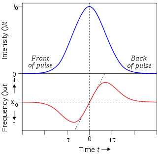 Plotting ω(t) shows the frequency shift of each part of the pulse. The leading edge shifts to lower frequencies ("redder" wavelengths), trailing edge to higher frequencies ("bluer") and the very peak of the pulse is not shifted. For the centre portion of the pulse (between t = ±τ/2), there is an approximately linear frequency shift (chirp) given by:
