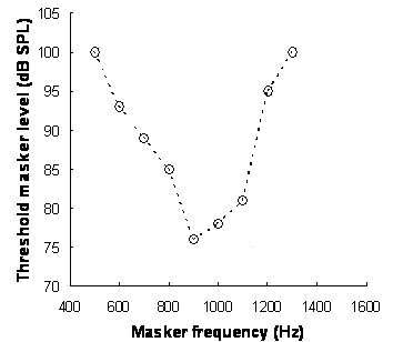 Although some debate continues regarding the reliability of such tests,[14] it has been suggested that psychoacoustic tuning curves (PTCs) and threshold-equalising noise (TEN) results may be useful in detecting dead regions, rather than PTA. PTCs are similar to neural tuning curves. They illustrate the level of a masker (dB SPL) tone at threshold, as a function of deviation from center frequency (Hz).[8] They are measured by presenting a fixed low intensity pure tone while also presenting a narrow-band masker, with a varying center frequency. The masker level is varied, so that the level of masker needed to just mask the test signal is found for the masker at each center frequency. The tip of the PTC is where the masker level needed to just mask the test signal is the lowest. For normal hearing people this is when the masker center frequency is closest to the frequency of the test signal (See Figure 9).[13]